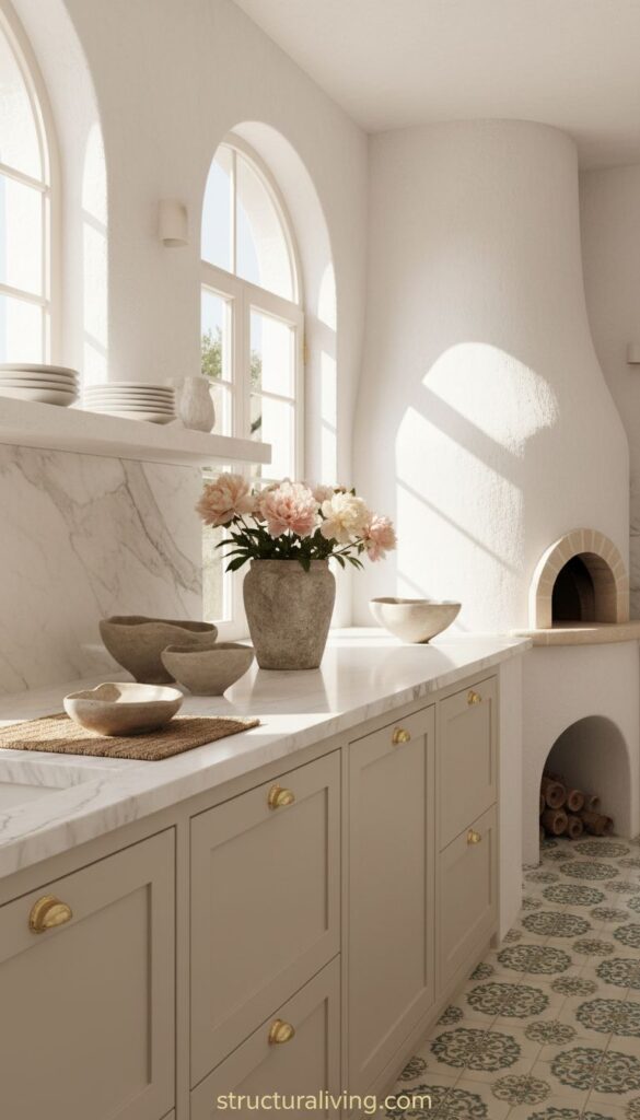 Using natural stone for kitchen counters is a great way to blend beauty with functionality. The image shows a kitchen featuring elegant stone surfaces that add a Mediterranean flair. The light tones of the stone contrast beautifully with the muted cabinetry, creating a warm and inviting atmosphere.