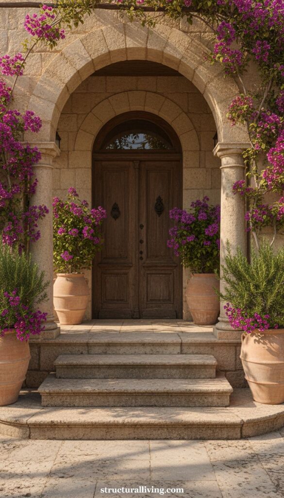Adding potted plants on either side of the steps softens the stone’s hard edges and introduces a splash of greenery. This natural element brings life to the space and complements the stone’s earthy tones. Overall, using stone for steps and pillars not only enhances the entryway but also aligns perfectly with the Mediterranean style.
