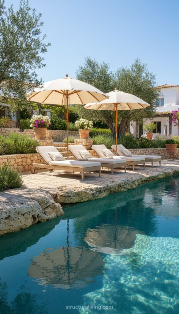 The texture and color of natural stone bring a rustic charm to the setting. Imagine stepping onto smooth stone tiles as you make your way to the water. This type of material not only looks appealing but also feels great underfoot, especially on hot days.