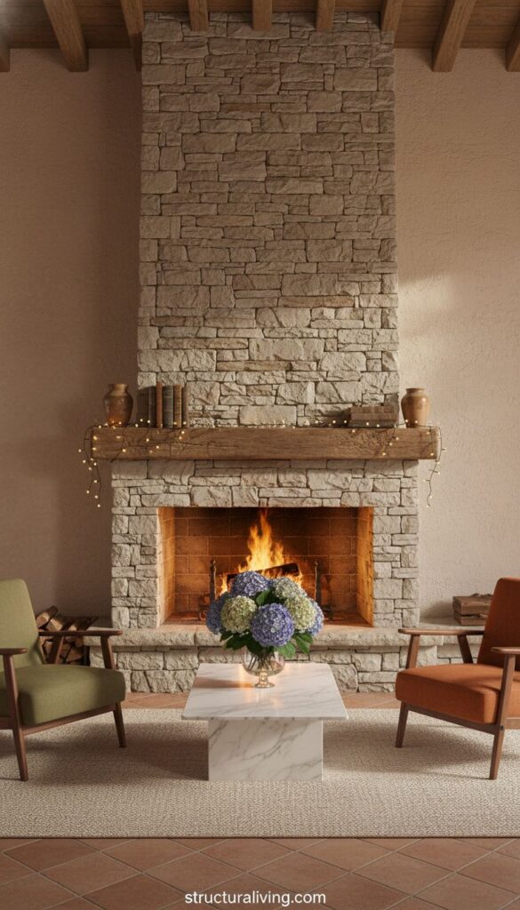 When designing your fireplace, consider a tall stone structure that reaches the ceiling. This design adds height and drama to the space. The choice of stone can range from rough-hewn pieces for a rustic vibe to smoother finishes for a more polished look. Either way, the natural stone ties beautifully with other Mediterranean elements.