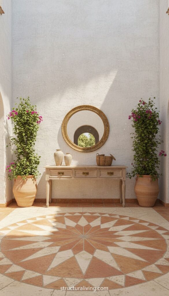 Stone flooring is a classic element in Mediterranean interiors that brings a touch of warmth and sophistication. The image showcases a beautiful space defined by its intricate stone patterns and textures. The thoughtful design incorporates both lighter and darker stones, creating a stunning visual contrast that guides the eye through the entryway.