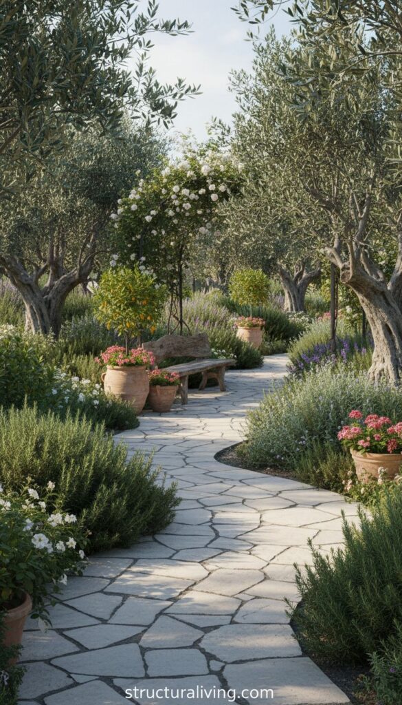 Natural stone brings a touch of authenticity to Mediterranean landscapes, and this image captures that essence beautifully. The winding pathway made from irregular stone slabs invites you to explore the garden, creating a seamless flow between natural elements.