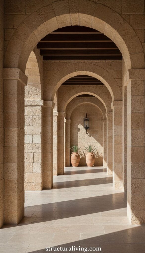 When you think of Mediterranean interiors, grand stone archways often come to mind. These archways create a sense of elegance and timelessness that enhances any space. The image captures a stunning hallway filled with impressive arches that draw the eye upward, highlighting the craftsmanship of stonework.