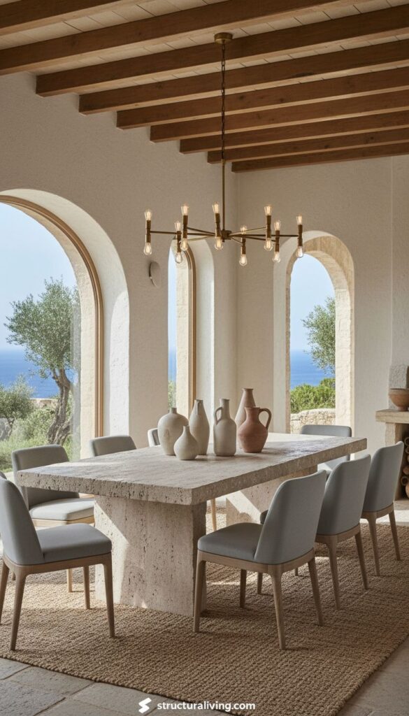 In Mediterranean interiors, stone accents play a key role in creating warmth and elegance. The image showcases a charming dining area that perfectly highlights this concept. The table features a sturdy stone top, which not only adds durability but also enhances the natural beauty of the space.