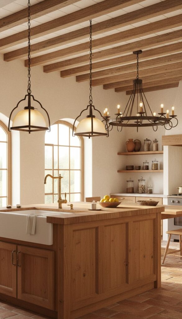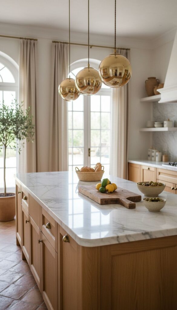 When choosing light fixtures, consider the size of your kitchen island. Large fixtures can become a focal point, while smaller ones can provide subtle illumination without overwhelming the space. Pairing these lights with other Mediterranean elements, like terracotta pots or patterned tiles, can help create a cohesive look.