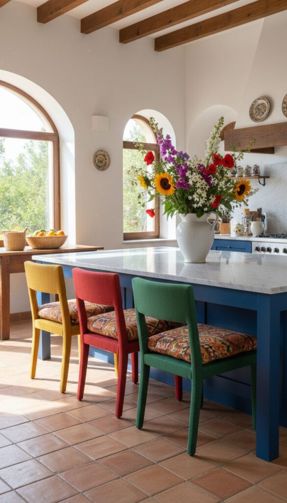 Incorporating such chairs also allows for easy updates to your kitchen design. If you ever want to refresh the look, swapping out the chairs for a different color or pattern can make a big difference without a complete overhaul. Plus, they pair beautifully with decorative elements like fresh flowers or fruits on the counter, adding to that Mediterranean charm.