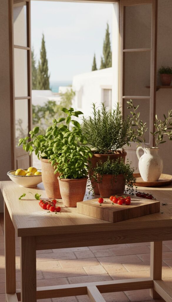 The Mediterranean influence is evident in the warm wooden cabinetry and the earthy tones throughout. Simple decor, like the potted plants and kitchenware, adds character without overwhelming the space.