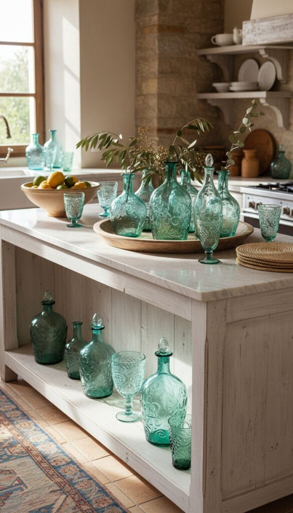 The beauty of vintage Mediterranean glassware adds a unique charm to any kitchen island. In the image, you can spot various pieces that reflect the rich culture and artistry of the Mediterranean region. The aqua and green tones of the glass vases are particularly eye-catching, creating a lovely focal point on the countertop.