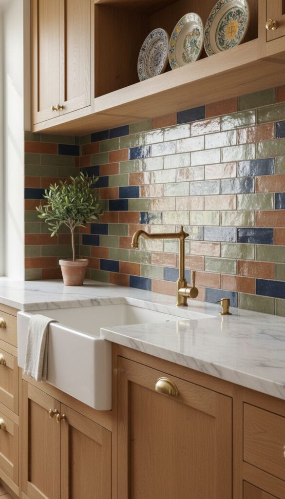 Colorful artisan-style handmade tiles in a Mediterranean-inspired kitchen backsplash