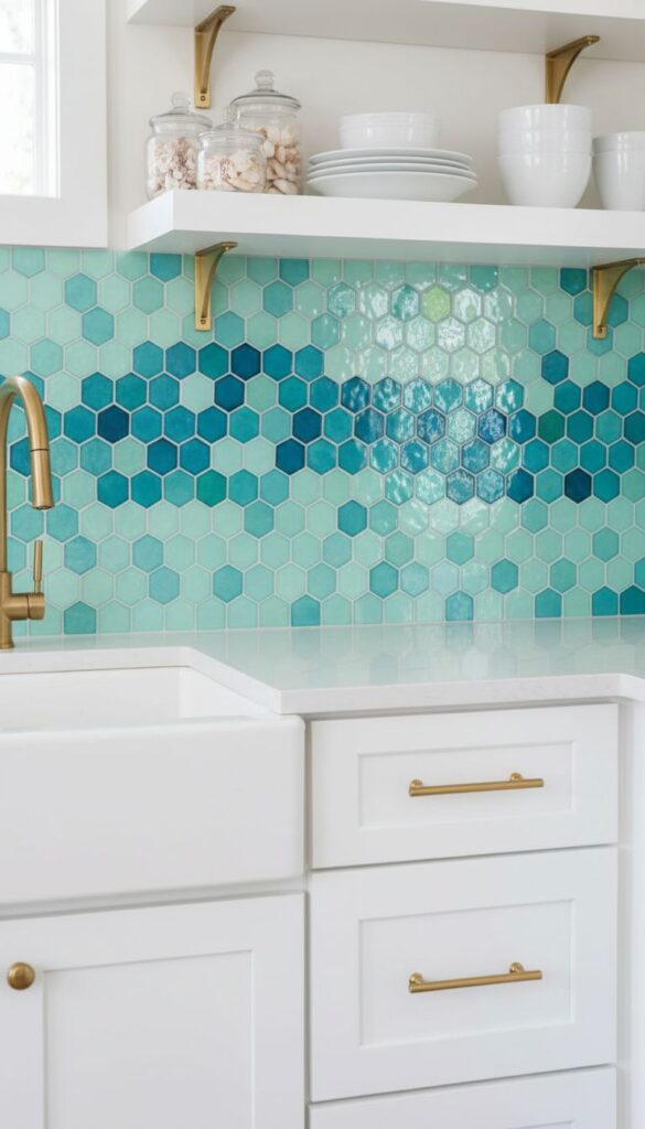 A kitchen backsplash featuring sea-inspired glass tiles in shades of turquoise and blue.