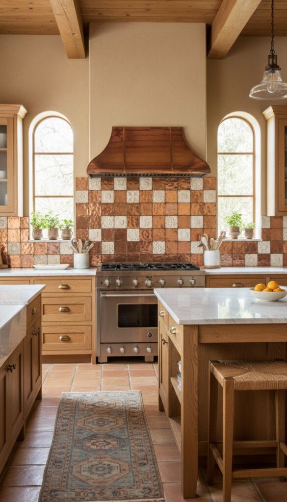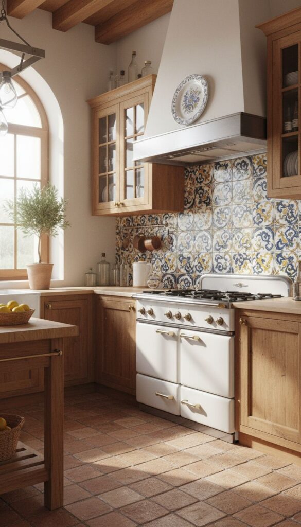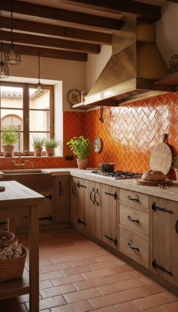 When you think of Mediterranean design, classic terracotta tiles often come to mind. These earthy tones create a warm and inviting atmosphere, perfect for a cozy kitchen. The rich oranges and browns of the tiles can complement wooden cabinetry beautifully, as seen in this image.