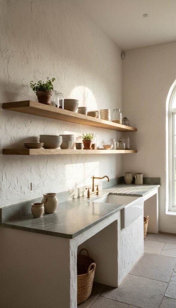 The subtle relief patterns on the plaster add an artistic touch. This can make your kitchen feel like a cozy café, perfect for chatting with friends while preparing a delicious meal. Pairing it with natural wood accents, like the open shelves and the hood, enhances that Mediterranean vibe.