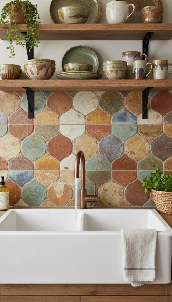 A colorful backsplash featuring traditional Zellige tiles in various shapes and colors.