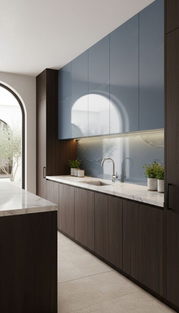 Sea-inspired glass tiles can transform your kitchen into a serene space reminiscent of the Mediterranean coast. The vibrant shades of turquoise and blue in this backsplash instantly evoke feelings of being by the ocean. It’s a lovely way to bring a touch of nature indoors.