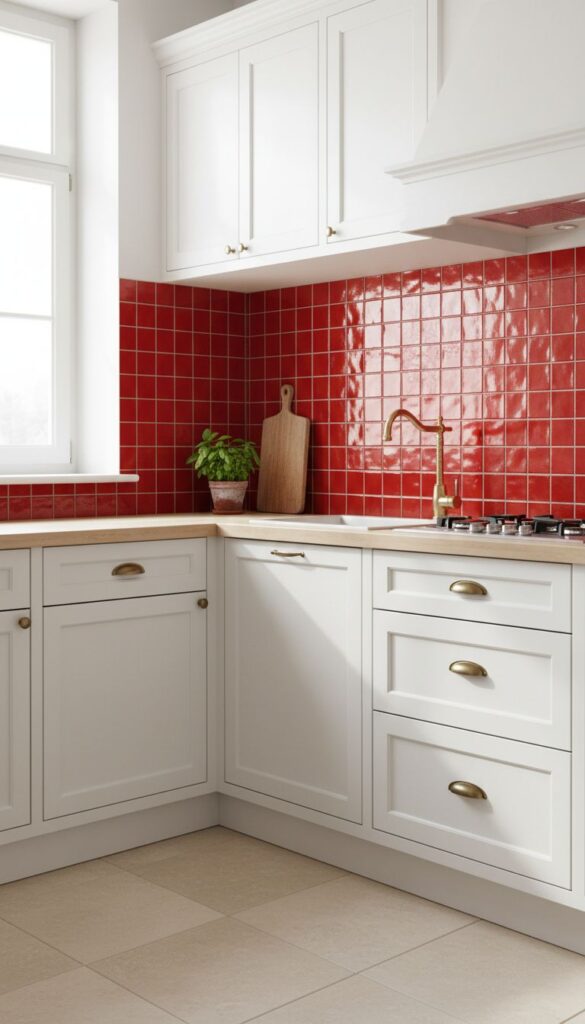 The image showcases a striking red tile pattern that catches the eye. This color not only adds energy to the space but also pairs well with various kitchen styles, from modern to rustic.