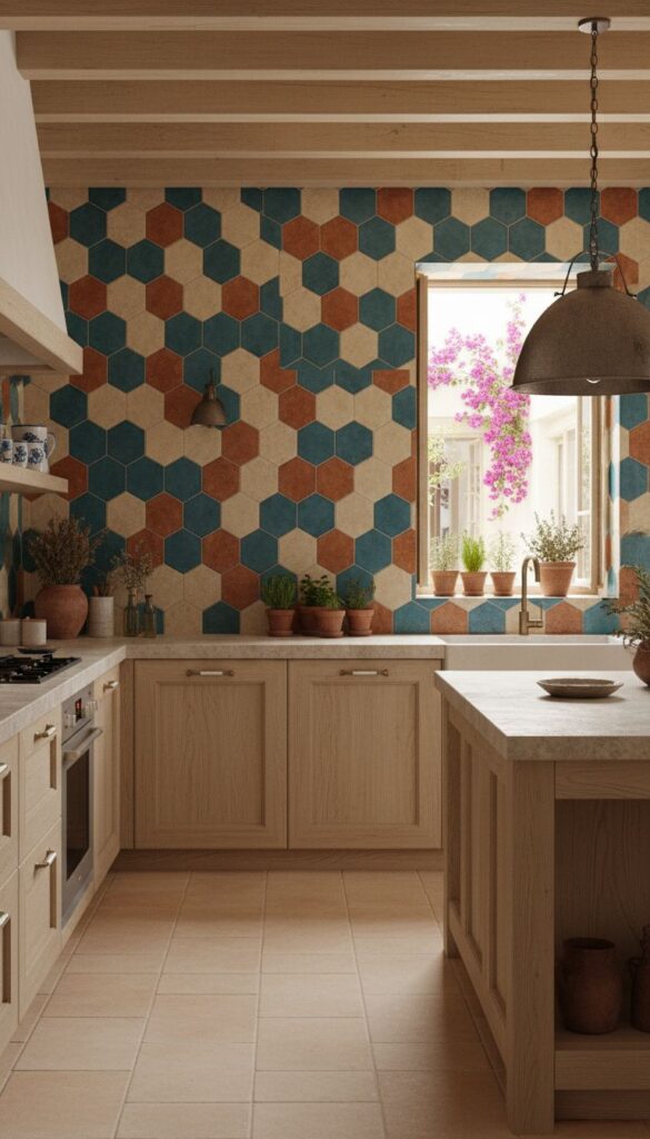 Geometric ceramic designs are a fantastic way to bring a splash of Mediterranean style into your kitchen. The image shows a vibrant backsplash featuring hexagonal tiles in an array of colors and patterns. This playful mix of shapes not only adds visual interest but also evokes the lively spirit of Mediterranean culture.