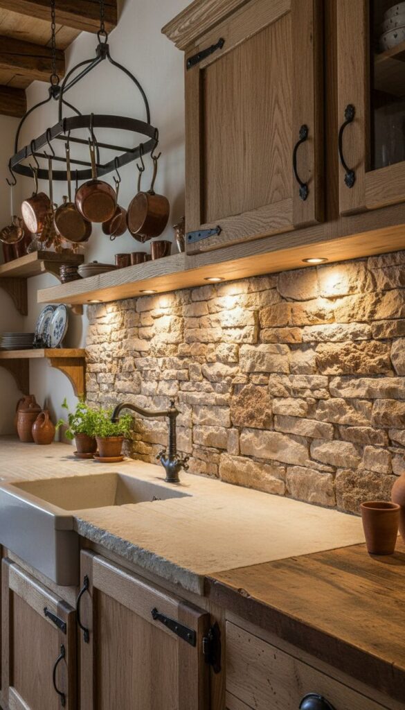 The uneven surfaces and varied colors of the stones add depth and interest. They remind us of Mediterranean villas where life feels simpler and more connected to nature. Pairing these stone accents with warm lighting enhances their beauty, making the kitchen feel welcoming.