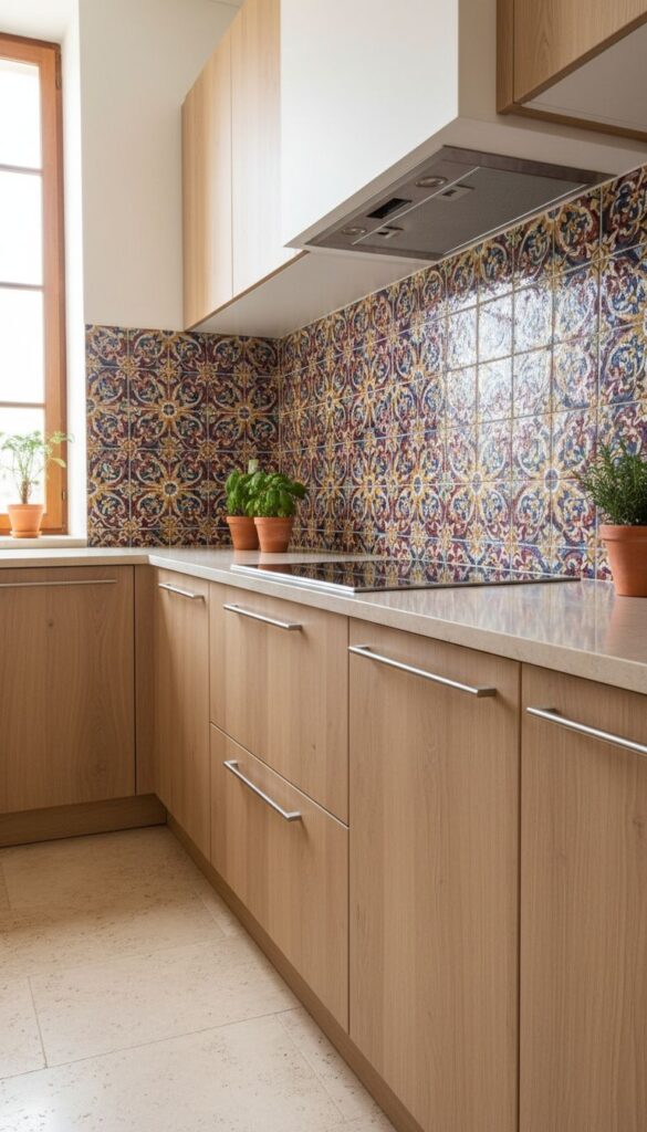 The color palette features rich oranges, blues, and cream, which are reminiscent of the sun-drenched landscapes of Mediterranean regions. Each tile tells a story with its distinct pattern, making your kitchen feel like a cozy retreat. This element of design not only serves a functional purpose but also enhances the overall aesthetic.