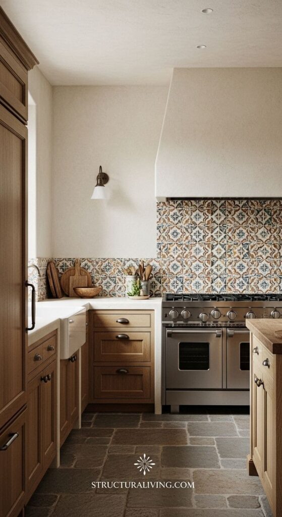 You might notice the smoothness of the painted walls contrasted with the unique patterns of the tiles behind the stove. This combination highlights the charm of Mediterranean design, where texture plays a key role in setting the mood. The soft light that filters through the space enhances these textures, inviting you to explore the kitchen.