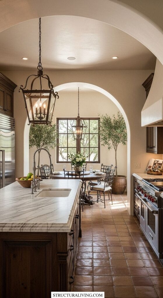 A Mediterranean kitchen featuring elegant archways separating the dining area from the cooking space, with a lantern hanging from the ceiling.