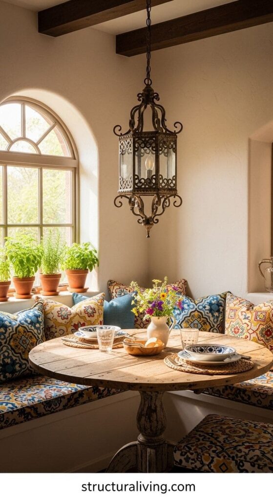 Creating a warm and inviting dining nook can transform your kitchen into a favorite gathering spot. Imagine a charming space where family and friends can enjoy meals together, sharing stories and laughter. The image showcases a delightful nook that embodies the spirit of Mediterranean decor.