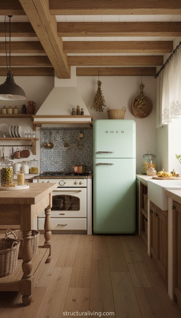 A cozy kitchen featuring vintage-style appliances, warm wooden beams, and a retro green fridge.