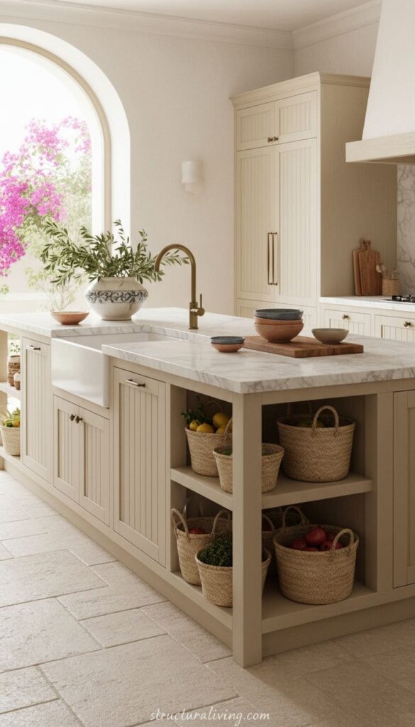 A charming Mediterranean kitchen island with a light color palette, featuring a marble countertop, decorative baskets, and stylish storage options.