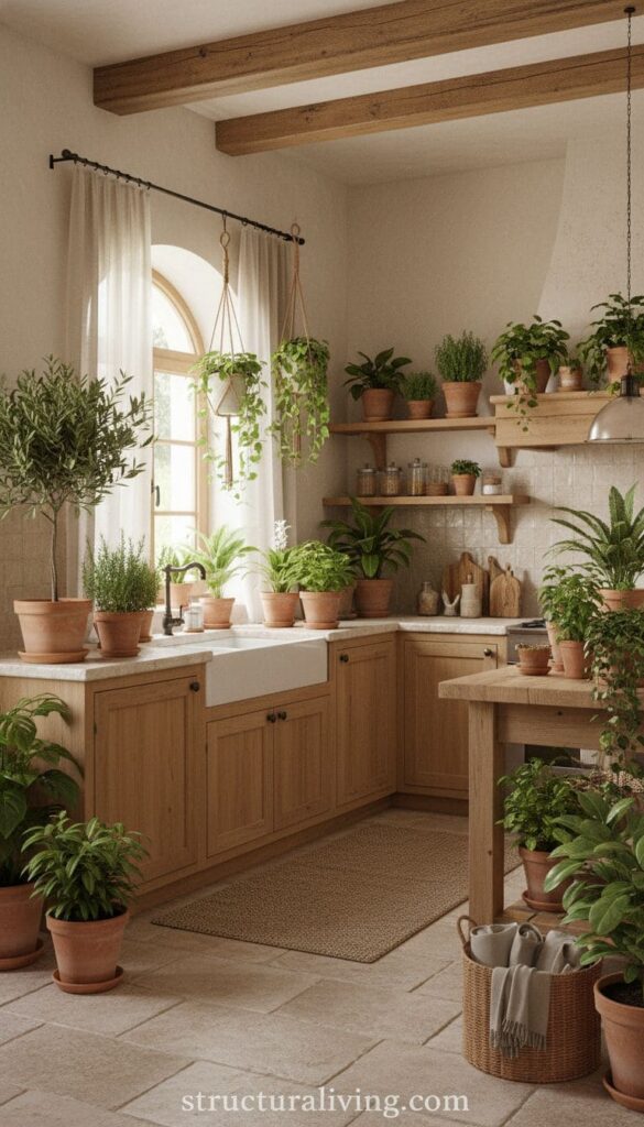 Using terracotta pots complements the Mediterranean theme beautifully. Their warm tones blend seamlessly with the natural elements of the kitchen. You can also grow your herbs in these pots, making them both decorative and functional. Imagine snipping fresh basil or rosemary while cooking!