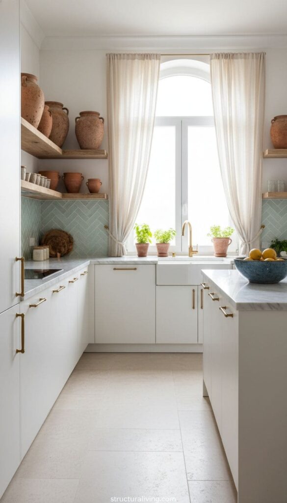 Don’t forget to incorporate some greenery! A small plant or herbs in a pot can add life to the shelves, connecting the kitchen to the Mediterranean ethos of fresh, vibrant living.