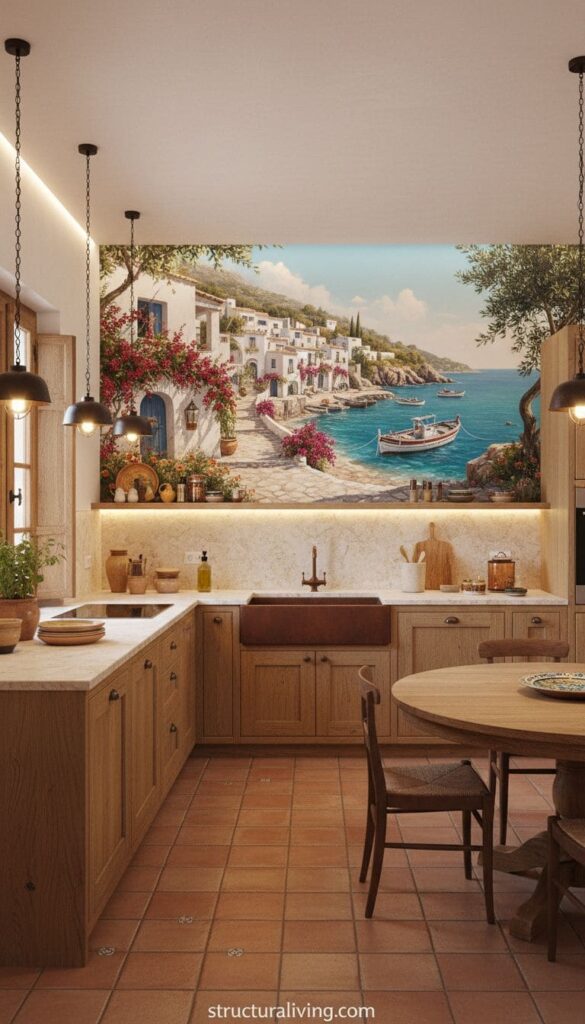 Consider incorporating similar murals or wall art that reflects your personal style. Whether it’s a scenic view, traditional patterns, or vibrant colors, the right artwork can truly elevate your kitchen decor. So, take a step back, choose an art piece that resonates with you, and let your kitchen speak the language of the Mediterranean.
