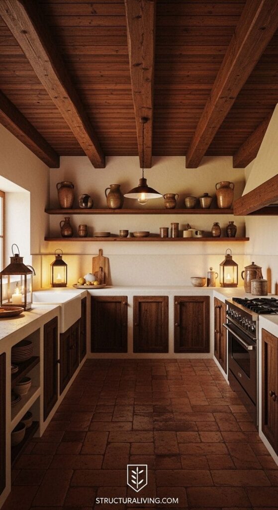 Consider adding other rustic elements, like vintage light fixtures or handcrafted pottery, to complement the beams. Such details can enhance the overall Mediterranean feel and complete the look of your kitchen.