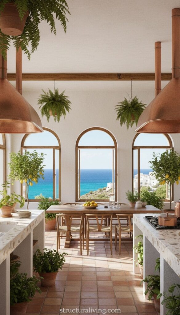 Choosing materials like reclaimed wood, stone, and pottery not only adds character but also reflects a commitment to sustainability. This kitchen design encourages a connection to nature, making it a welcoming space for family gatherings or quiet moments. Incorporating these elements into your kitchen can transform it into a serene Mediterranean retreat.