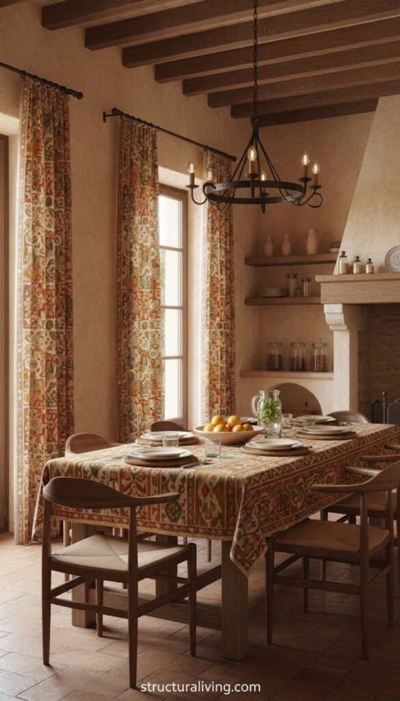 A Mediterranean kitchen featuring patterned curtains and tablecloths, with warm colors and charming decor.