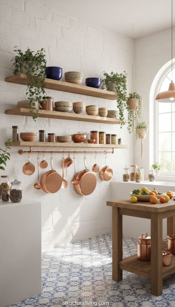 Consider incorporating similar elements in your kitchen. Floating shelves can display your favorite dishware or decorative items, while hooks can organize cooking tools. This approach not only clears up counter space but also contributes to a timeless Mediterranean vibe.