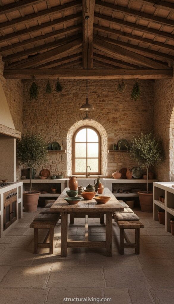 A Mediterranean kitchen featuring natural materials, wooden beams, stone walls, and rustic decor.
