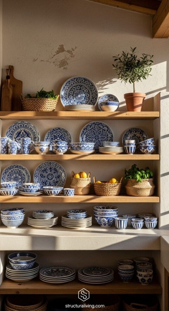 A kitchen with open shelving displaying a variety of decorative dishware and a small plant, showcasing a Mediterranean style.