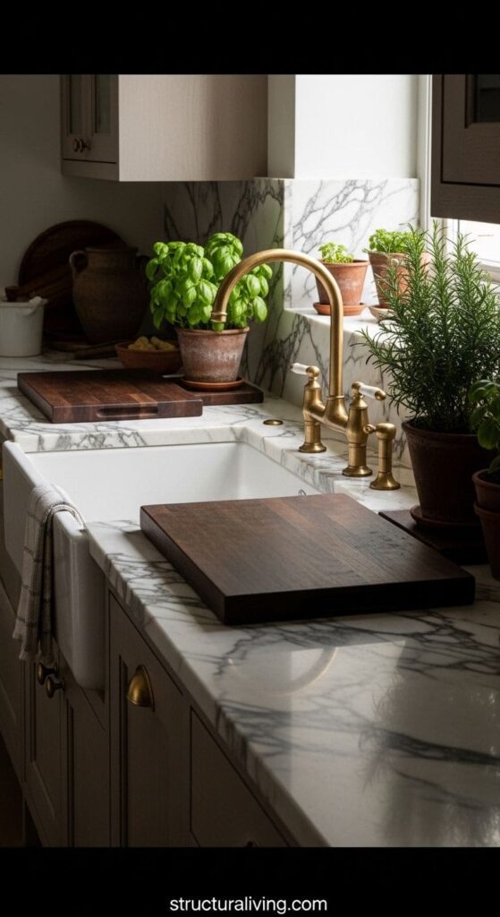 These countertops not only look fantastic but are also durable. They can handle the day-to-day demands of cooking and entertaining. Whether you’re chopping fresh herbs or rolling out dough, natural stone is up for the task. The earthy tones in the stone harmonize beautifully with wooden elements and greenery, like the herbs seen in the image, enhancing the overall Mediterranean vibe.