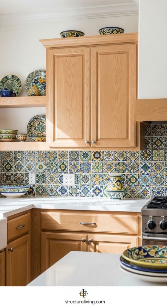 Colorful ceramic tile backsplash in a Mediterranean kitchen with floral patterns