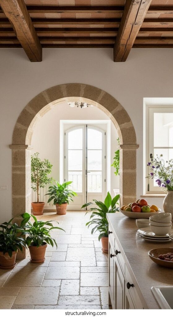 A Mediterranean kitchen featuring classic arched doorways with wooden beams and plants.