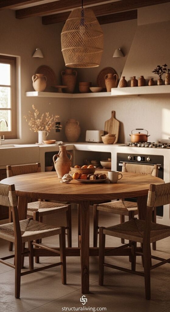 A cozy Mediterranean-style kitchen featuring a wooden dining table with chairs, warm tones, and rustic decor.