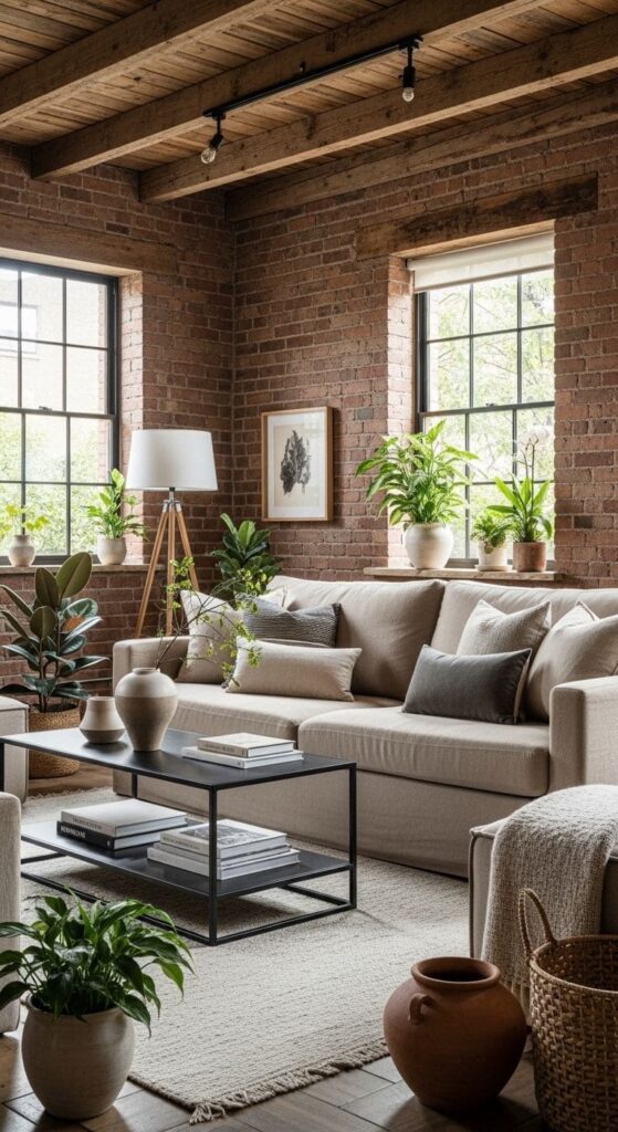 A cozy living room with natural elements, blending industrial and farmhouse design.