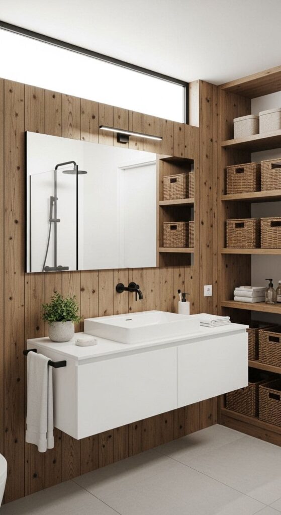 A modern bathroom featuring sleek finishes and rustic wooden elements