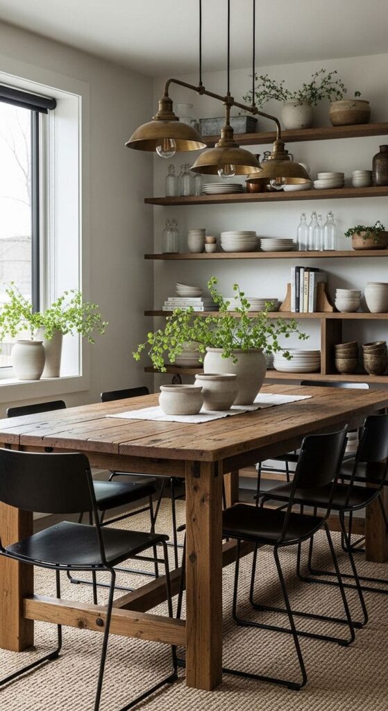 The blending of these elements is key to achieving a cohesive design. The wooden shelves and dining table provide a warm, organic feel, while the metallic accents—like the lamps and exposed ductwork—bring a contemporary edge. Together, they create a space that feels both lived-in and polished.