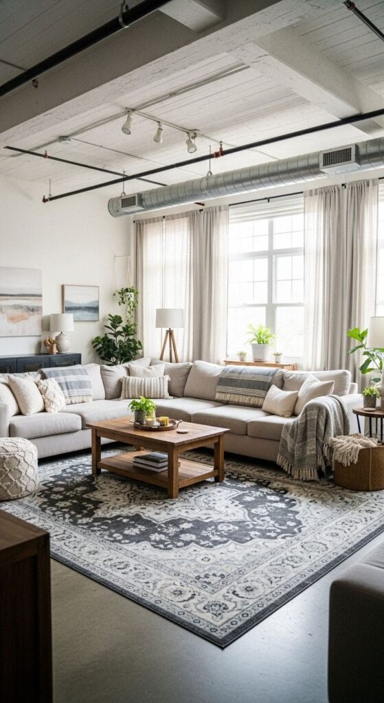 Cozy textiles play a crucial role in softening the industrial elements. Plush sofas adorned with soft cushions invite relaxation, while the patterned area rug adds warmth underfoot. The mix of textures, from the smooth fabric of the upholstery to the natural wood of the furniture, creates a balanced look.