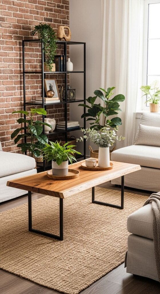 Green plants bring life and vibrancy, softening the overall look. They are essential in bridging the gap between industrial and farmhouse elements, adding a touch of nature. The round coffee table, with its minimal design, complements the industrial vibe while still feeling cozy and welcoming.