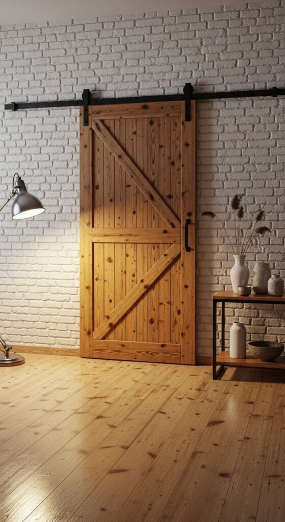 A wooden barn door with a sliding mechanism, showcasing its natural texture against a white brick wall.