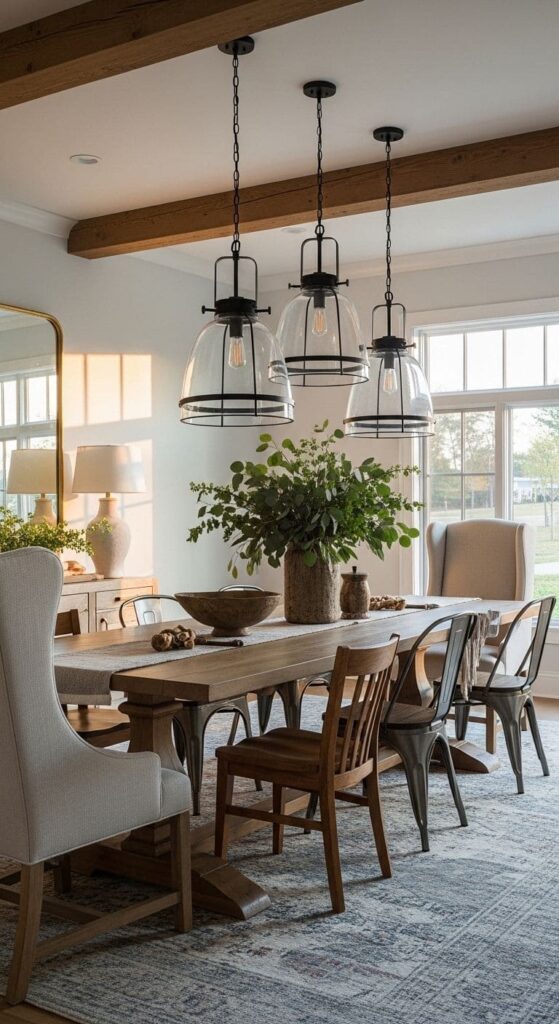 Lighting can make or break a space. In a design that combines industrial and farmhouse elements, lighting fixtures play a crucial role. The image shows a stunning setup with hanging glass pendants that blend seamlessly into a cozy dining atmosphere.