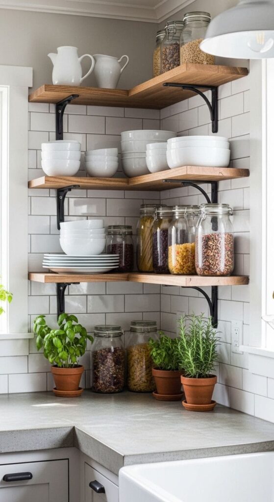 Open shelving is a fantastic way to merge industrial and farmhouse styles. It invites a casual vibe while showcasing items that tell a story. The image perfectly illustrates this blend with its wooden shelves and a variety of containers and dishes.